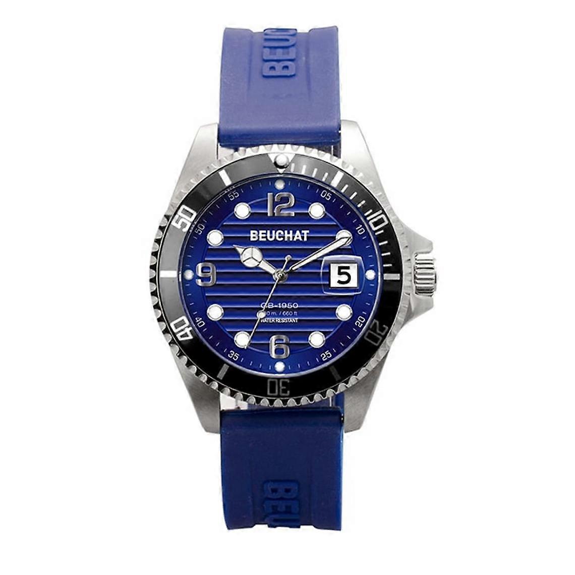 Type: Montre Marque: Beuchat Genre: Homme Styles: Sport Age: Adulte Couleur du bracelet: Bleu Mouvement: Quartz Matière Bracelet: Caoutchouc Affichage: Analogique Etanchéité: 200 m (20 ATM) Matière Boitier: Acier Forme de Boitier: Rond