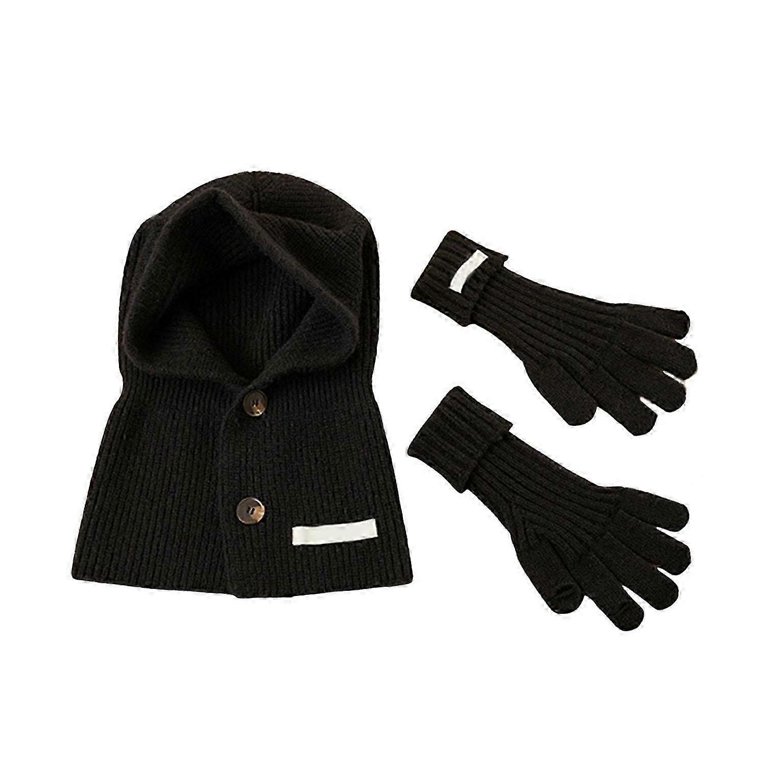1 Set Women Winter Hat Gloves Set Knitted Solid Color Button Closure Elastic Scarf Integrated Head