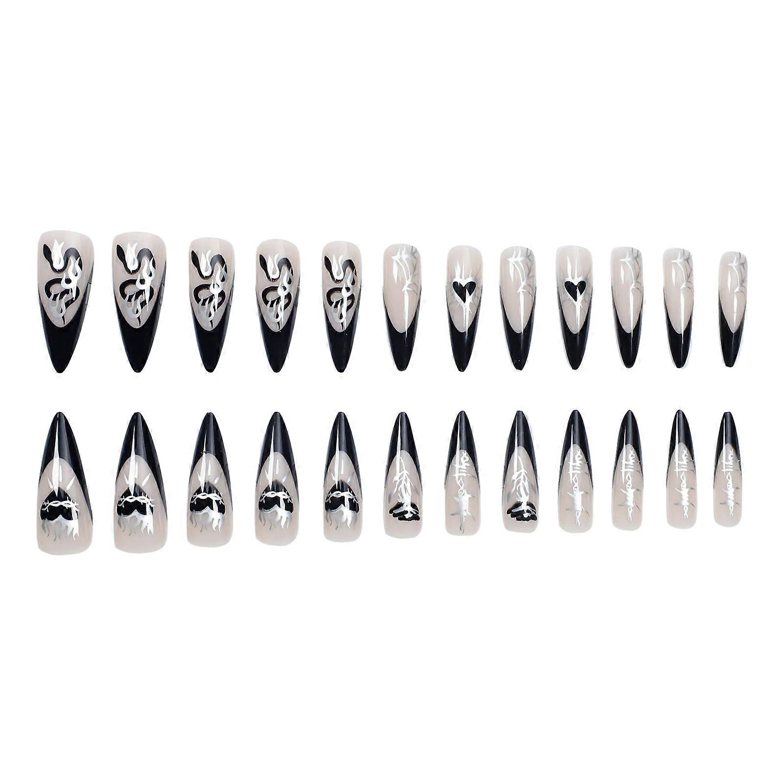 Features: Unique Style Selection: Elevate your nail game with our dark black press on nails featuring almond french tip design and eye-catching heart and snake designs. Versatile Usage: These natural women nail decorations are suitable for girlfriends, women, and girls of all ages, making them a perfect gift option. Seasonal Charm: Get into the festive spirit with nails that are perfect for halloween, christmas, or any occasion that calls for a bit of fun and flair. Ideal for Special Occasions: Whether it's a wedding, date night, or holiday party, these nails are perfect for adding a touch of glamour to your look. Easy Application Process: Say goodbye to salon visits with our medium length full cover press on false nails that are easy to apply at home. Specifications: Material: Resin Style: French Notes: Please allow slightly errors due to manual measurement and different monitors. Include: 24PCS*Artificial Nails 1*Nail Files 1*Jelly Glue Set