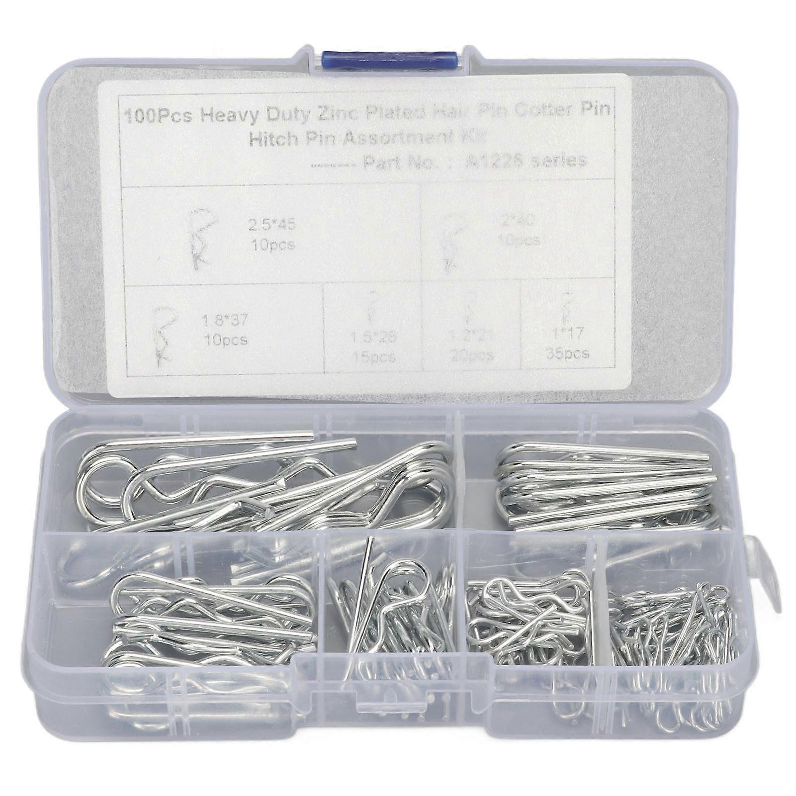 Features1SPECIFICATIONS: Including 100 pcs R pin clips with M1 M1.2 M1.5 M1.85 M2 M2.5 specifications to meet different usage needs. 2DOUBLE COIL: R type clip or spring cotter pin, double coil design allows for connecting cables, which are not easy to fall off or spread. 3CARBON STEEL: These R clips are made of carbon steel with zinc plated finish, corrosion resistant and oxidation resistant. 4GLOSSY FINISH: With fine workmanship, these R pin clips have a glossy finish that will not scratch or wear other parts when used. 5WIDE APPLICATION: Suitable for camping car, station wagon, RV, lawn machine, small engine maintenance and fastening, compact and durable.SpecificationItem Type: R Clip Assortment KitProduct Material: Carbon SteelFinish: Zinc PlatedApplication: Camping car, station wagon, RV, lawn machine, small engine repair and fasteningPackage List35 x M1x17 Clips20 x M1.2x21 Clips15 x M1.5x28 Clips10 x M1.85x37 Clips10 x M2x40 Clips10 x M2.5x45 Clips1 x Storage Box