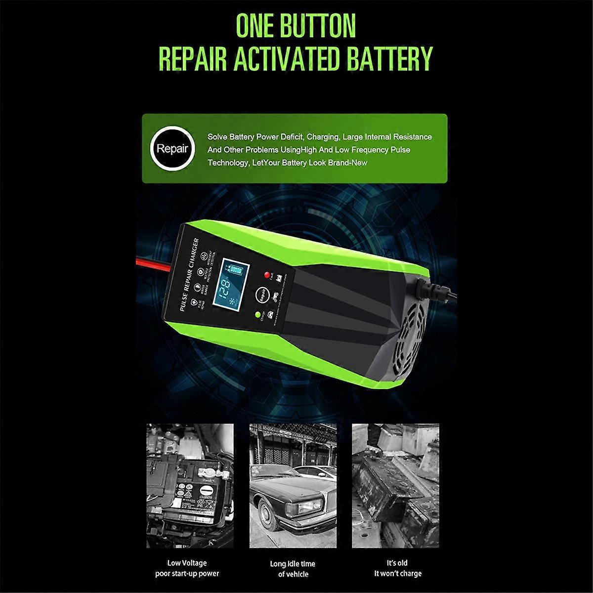 1. SMART AUTOMATIC CHARGING: This is a fully automatic battery charger. Automatic charging protects your battery from being overcharged. So you can leave the charger connected to the battery indefinitely. 2. chargers are suitable for most battery types including Calcium, Gel and , Wet batteries. They may also help restore drained and sulphated batteries. 3. Types of batteries: Most types of lead acid batteries including Calcium, GEL and , Wet,, etc.. 4. The pulse repair function repairs the aging battery, and the LCD screen displays the voltage and current. Winter and summer modes: it is not fully in summer, but fully in winter. It has comprehensive protection functions and a novel appearance. Touch switch mode technology: Yes Polarity protection: Yes Output short protection: Yes Non battery link protection: Yes Over temperature protection: Yes Short circuit protection: Yes Overcurrent protection: Yes Overheat protection: Yes Fire protection: Yes Low voltage protection: Yes Over voltage protection: Yes Reverse protection: Yes protection: Yes Cooling: Fan Input voltage:100-240V AC, 50-60Hz Rated output:12V/10A or 24V/5A Minimum start voltage:8.0V Max Power:150W Multiple modes:Car / motorcycle / / GEL / lead acid Mode:Summer/winter Display:voltage, current, temperature, repair, completion, reverse Thermal protect:65+/-5 Note:This Charger is for battery capacity between 120AH to 150AH, Pls check the capacity (AH) of your battery before buying the charger! Thanks! Plug Type:EU Plug,it applies to Indonesia, Germany, France, Spain, Italy and so on. Colour:Green & Black Material:ABS Voltage: AC100-240V Package Contents: 1 x 12V-24V Pulse Repair LCD Charger Only the above package content, other products are not included. Note: Light reflection and different displays may cause the color of the item in the picture a little different from the real thing. The measurement allowed error is +/- 1-3cm.