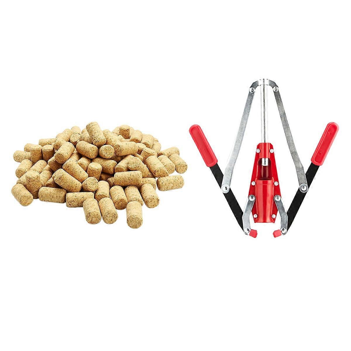 1pc Double Lever Hand Corker with 2 Handles & 100pcs Straight Wood Corks - Compatible with Wine Bottles