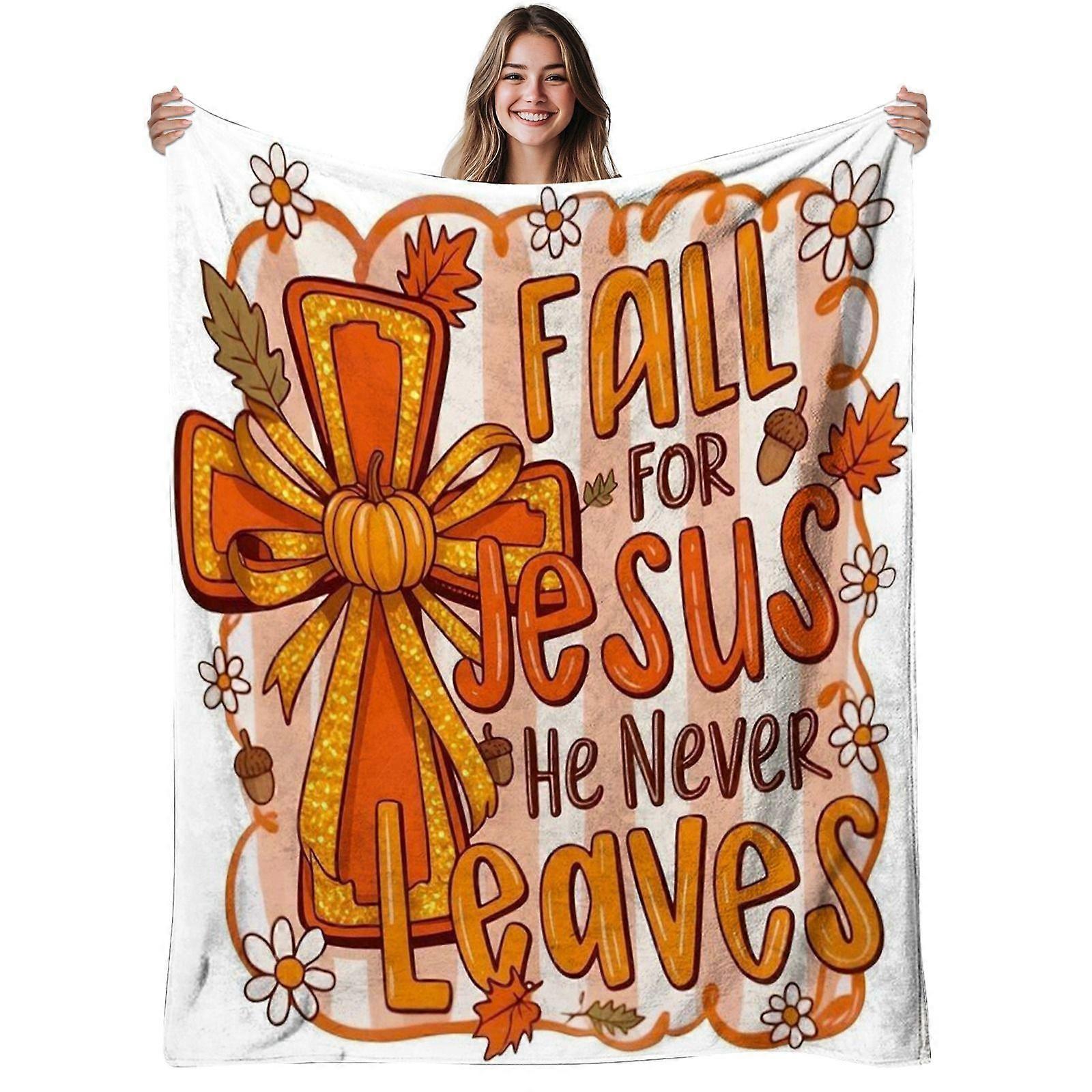 1pc Fall for Jesus He Never Leaves Flannel Blanket | Soft, Warm, Autumn Cross Pumpkin Leaves Design, Polyester, 280gsm, -qacvbg209