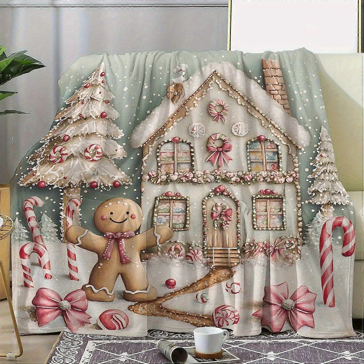 2D Printed Flannel Blanket Cozy Flannel Christmas Blanket with Gingerbread for Man, Candy House Tree DesignSoft, Warm Th-azxcv247