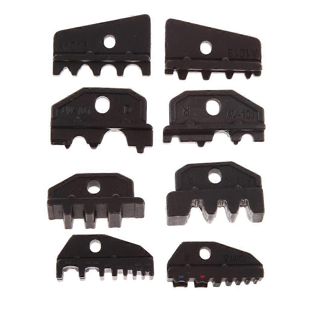Description: Made of high speed steel material, durable and solid Replace crimping plier die set, cable clamp pressed, terminal connectors Applicable to most types of non-insulated and insulated terminals and connectors You can use screwdriver for exchange of dies, makes your operation more convenient Terminal for crimping, light and compact structure ensures high accurate and perfect effect Specification: Material: High Speed Steel Color: Black Size: Approx. 4 x 1.5cm / 1.57 x 0.59in Size Chart: A03BC: 16-10AWG (0.5-6mm²), for Non-insulated Cables and receptacles A101: 16-8AWG (0.5-10mm²), for Non-insulated terminals A1016: Crimping Range (0.5-16mm²) A06WF2C: Crimping Range (0.5-2.5mm²) Package Includes: 8pcs Interchangeable Die Set Note: Please allow 1-2mm measurement error and color difference.