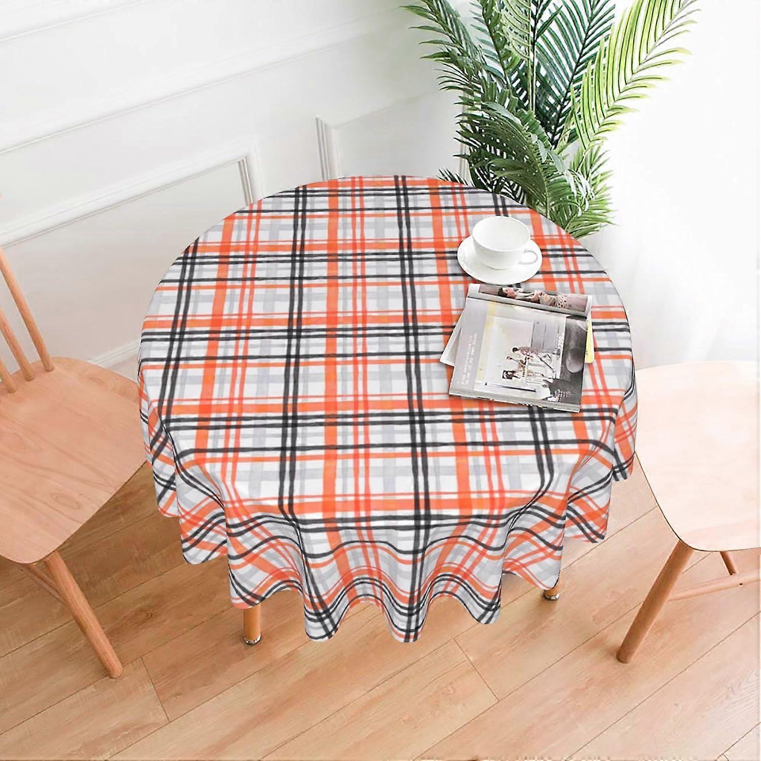 60 Inch Round Polyester Tablecloth with Orange Black White Plaid Print Table Cover Perfect for Fall Winter Thanksgiving Christmas Holidays & Occasions