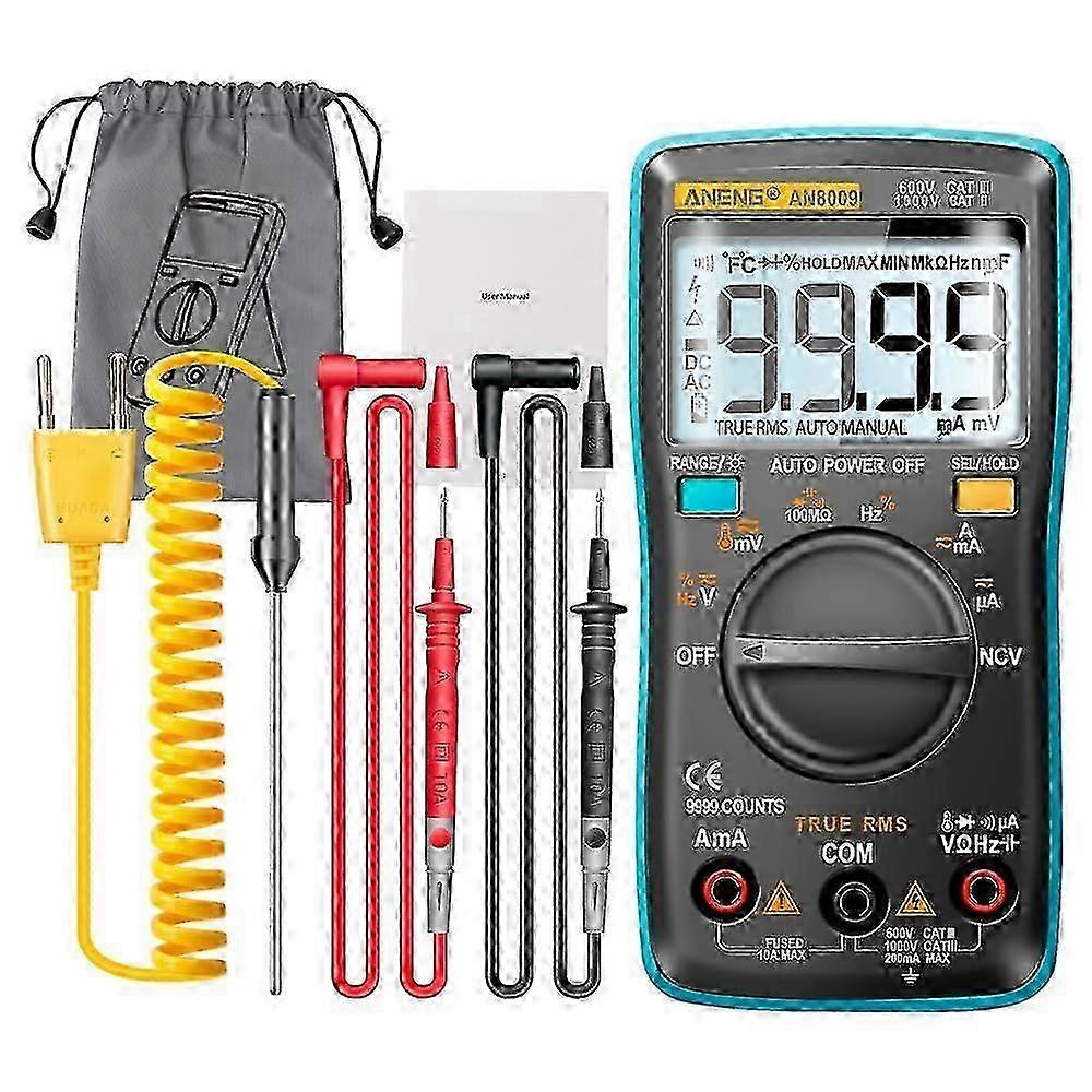 AN8009 Digital Multimeter Auto Range 9999 Counts Backlight AC DC Volt Ammeter Ohm Transistor Tester Blue