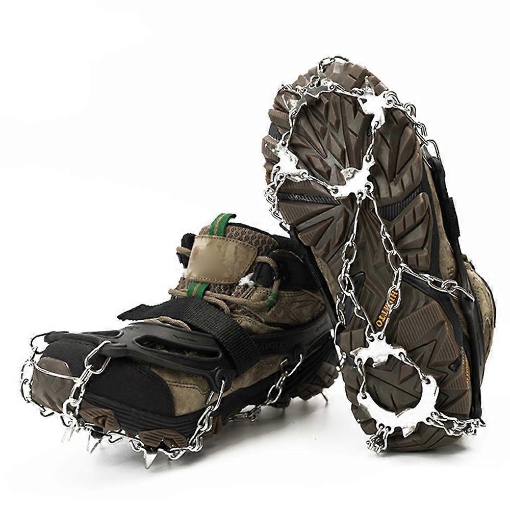 AOTU AT8607 1 Pair 19 Teeth Anti-slip Crampons TPE+Stainless Steel Ice Snow Ground Shoe Grippers - Black/M •The chain and claws are made of stainless steel,guaranteed not to rust •Made of thermoplastic elastomer TPE material,high elasticity,aging resistance,recyclable,not easy to break •Easy to use,fits over most shoes and boots •Suitable for snow walking,snow mountaineering,glacier hiking,etc. Specification: •Model: AT8607 •Material: thermoplastic elastomer TPE + stainless steel •Number of teeth: 19 teeth •Size: M,L,XL •M size: 18*13*0.5cm (flat length*width*thickness),Suitable for 36-41 size shoes •L size: 20*13.5*0.5cm (flat length*width*thickness),Suitable for 42-44 size shoes •XL size: 21.5*15*0.5cm (flat length*width*thickness),Suitable for 45-47 size shoes •Weight: M size: 425g; L size: 435g; XL size: 495g Package included: •1 x Pair of Anti-slip Crampons •1 x Nylon Storage Bag •Not include shoes