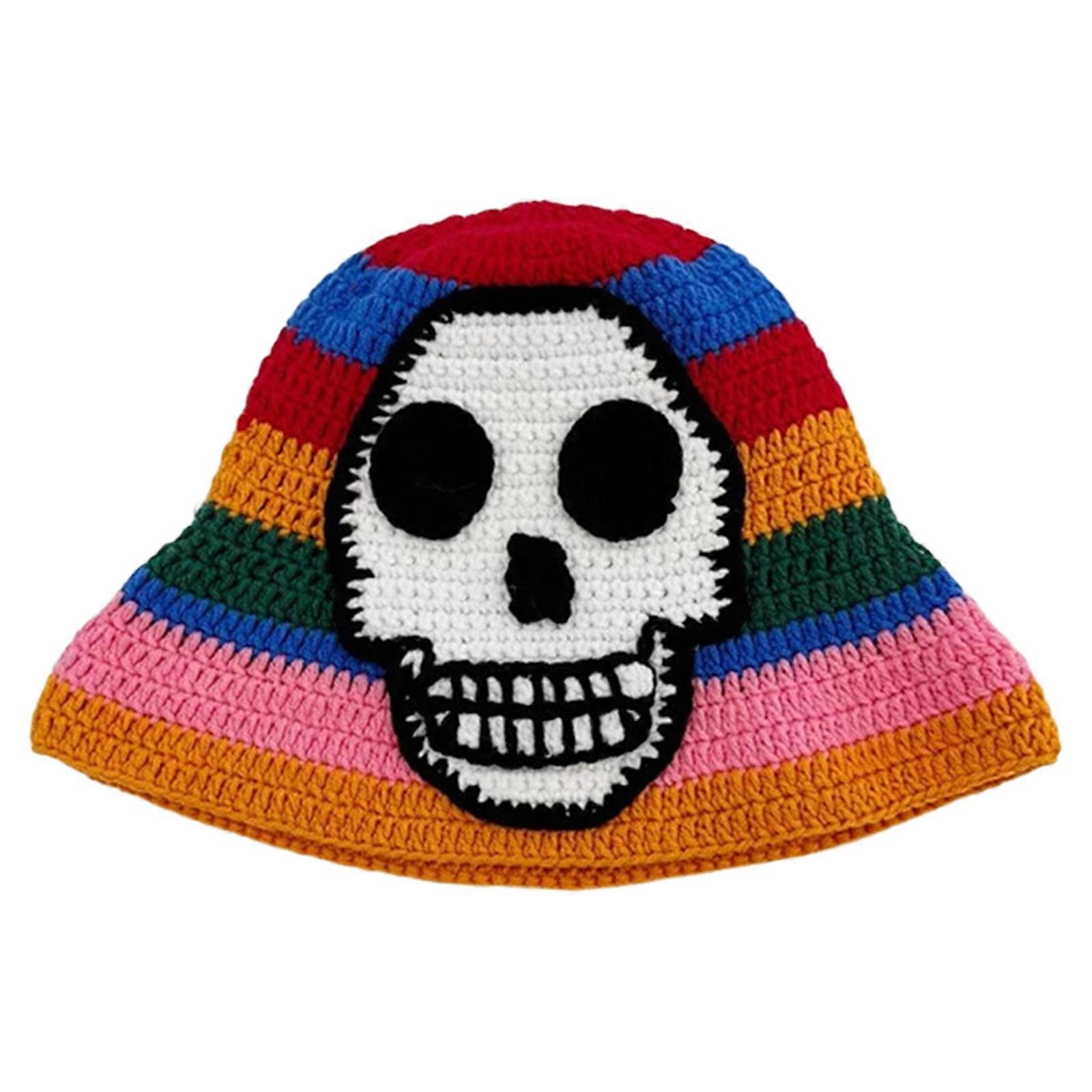 Colorfast Acrylic Knitted Bucket Hat Skull Pattern With Ruffled Edge Lightweight Headgear For Unisex Multicolor