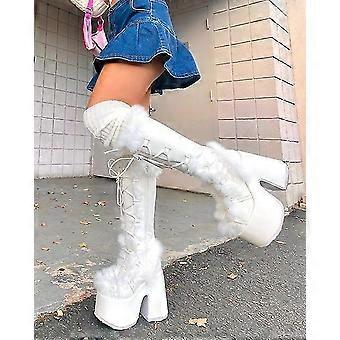 Bílé kožešinové boty na platformě s vysokým robustním podpatkem a kulatou špičkou do půli lýtek Elegantní dámské oblečení na volný čas Zimní křížově vázané boty Botas Mujer
