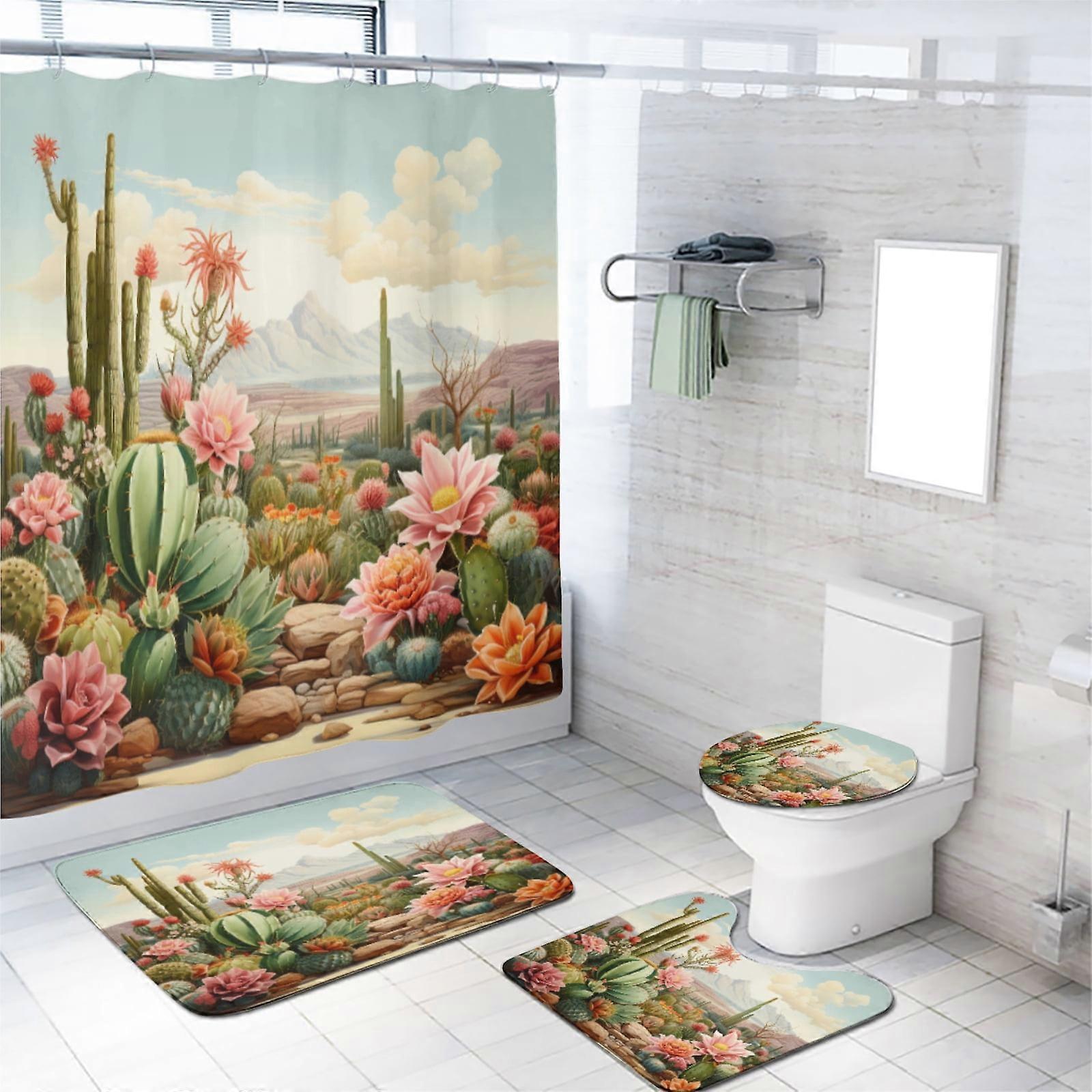 Cactus 4-Piece Shower Curtain Set with Non-Slip Rugs, Toilet Cover & Bath Mat - Desert Tropical Design, 72x72 Inch