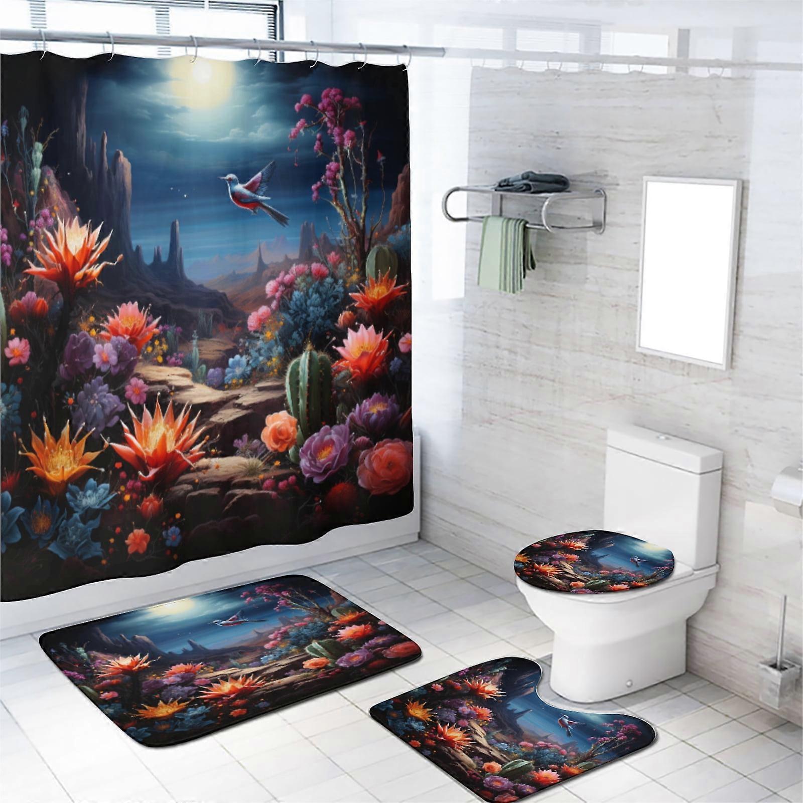 Cactus 4PCS Shower Curtain Set with Non-Slip Rugs, Toilet Lid Cover & Bath Mat - Desert Succulent Design, 72x72 Inch