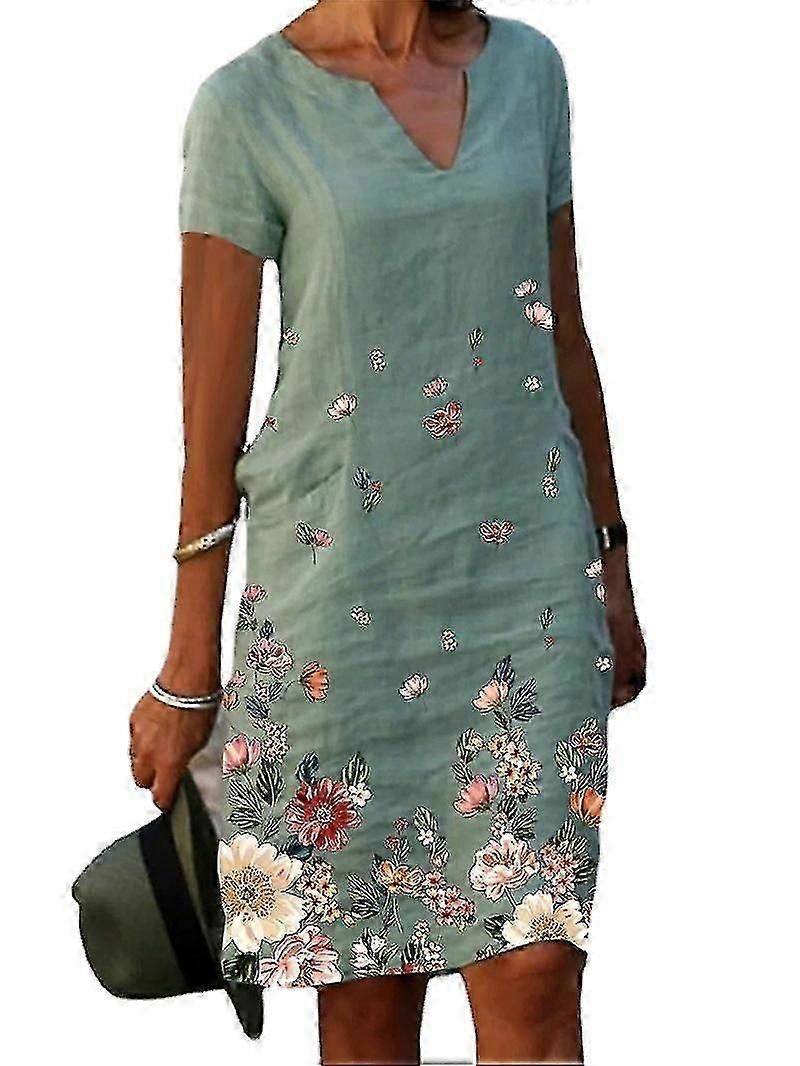 Women Girls Dress Comfortable Floral Printed Cotton And Linen Short Sleeve Midi V-neck