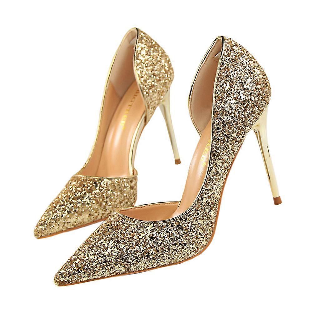 Elegant Shoes For Women High Heel Sequins Evening Party Shoes Pointed Toe Design Golden Color 1 Pair