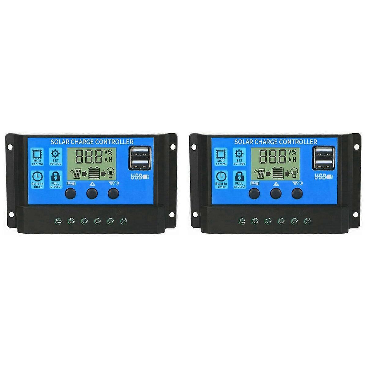 [100A SOLAR CHARGE CONTRALLER] Solar Charge controller compatibility for 12V and 24V system, Advanced maximum power point tracking (PWM) technology can improve efficiency by 10%-30%. [MULTIPLE INTELLIGENT PROTECTION] Built-in overcurrent protection, short circuit protection, reverse connection protection, open circuit protection, all automatic recovery, no damage to the controller, a reliable protector for your devices [LARGE LCD SCREEN] Easy to install and operate, Intuitive LCD display that can clearly indicate the status and data is to switch modes and parameter configuration, The level of complete power-off is adjustable, which can ly protect the lithium battery from over-discharge, suitable for home, industrial, commercial etc [PLEASE NOTE] The solar controller is only suitable for lead-acid batteries: OPEN, , GEL, not suitable for nickel metal hydride, lithium ions or other batteries. The built-in industrial Mini controller can automatically manage the work of solar panel and battery to charge [WIDELY APPLICABLE] Solar panel suitable for solar power system, solar street lamp, smart home, solar light box, intelligent irrigation, camping lantern, for home, industrial, commercial etc Material: plastic colour: blue Package Contents: 2 x Solar Charge Controller Only the above package content, other products are not included. Note: Light reflection and different displays may cause the color of the item in the picture a little different from the real thing. The measurement allowed error is +/- 1-3cm.