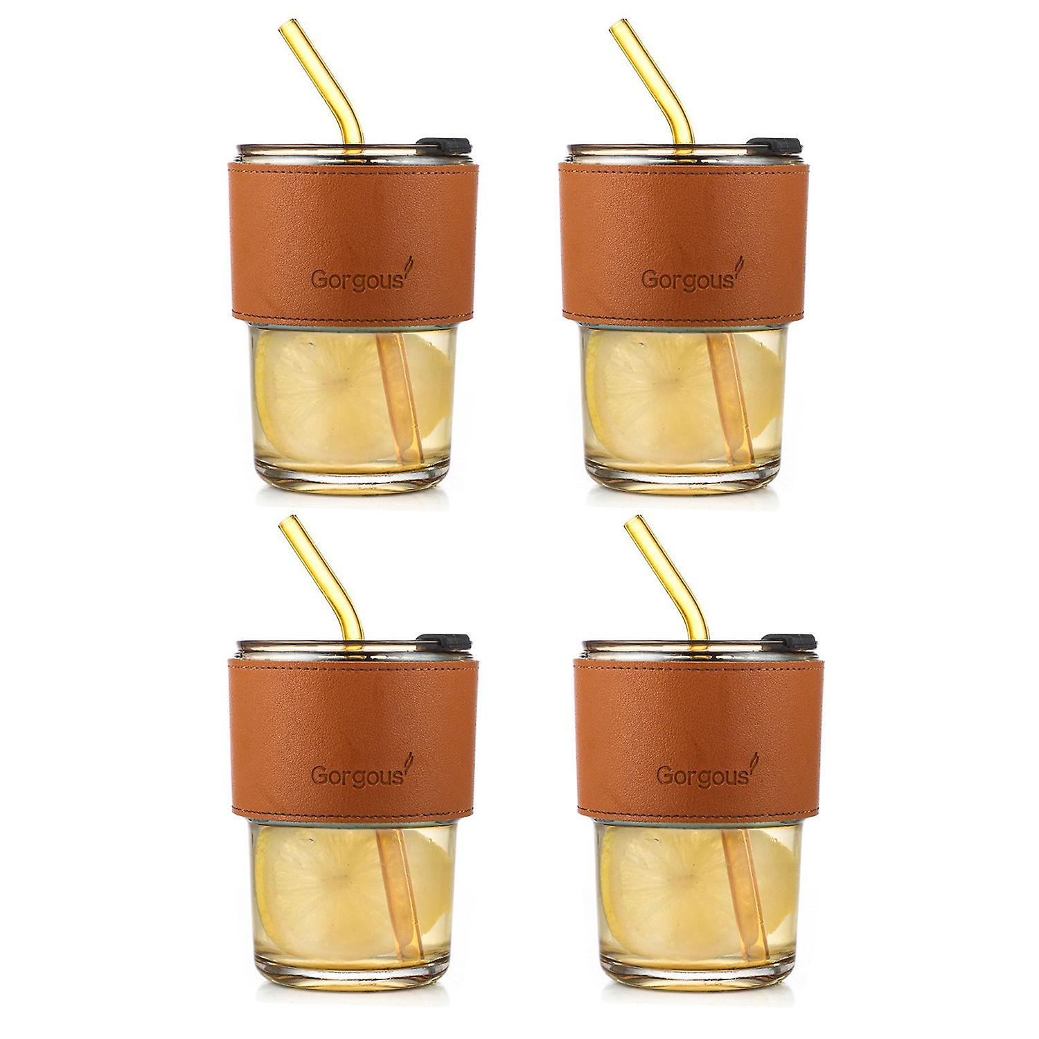 Set of 4 Glass Cups With Holder, Lid and Straw – 450ml Capacity