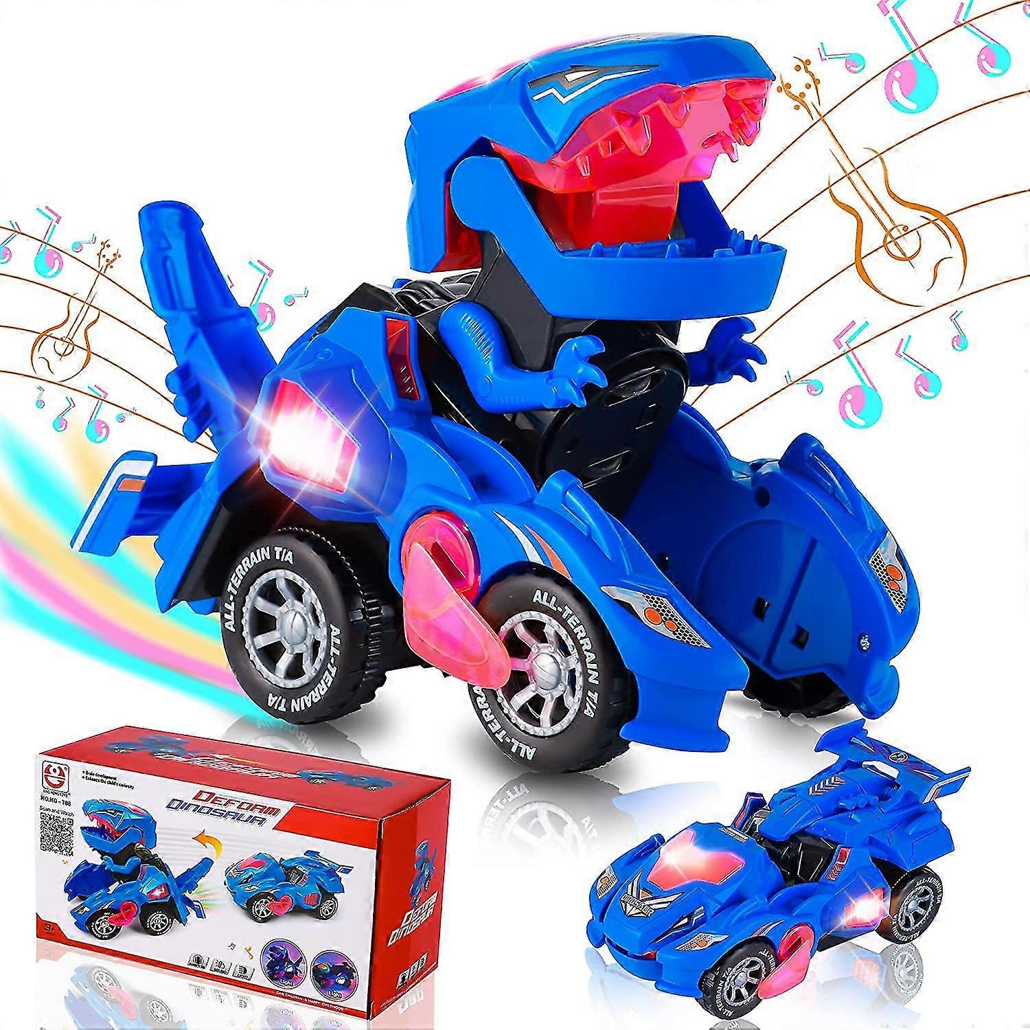 AUTOMATIC TRANSFORMING -- Dinosaur cars is a toy that combines dinosaurs and cars into one! It will automatically turn into a dinosaur! The novelty transforming vehicle toy, when it encounters an obstacle, will randomly change the direction of travel, and driving a distance will automatically become a dinosaur, then change back into the car, going on driving. which will definitely brighten children's eyes. FLASHING LED LIGHT AND SOUND -- With lights and music, it will make the coolest roar. With a battery, you can have brilliant LED lighting effects! Lights can be automatically changed according to music.This deformation car needs 3 AA Batteries(not included). the headlight on the top of the dinosaur will change in accordance with the changing sound. ANTI-COLLISION & SHOCKPROOF -- The 4 wheels inertia drive push car for toddlers are made of durable ABS eco-friendly plastic. With 4 shockproof springs, the monster car protects the body from crashing and makes the trucks driving smoother. Size: 8*4.3*3.5 inch. Perfect for age 3+ kids playing. FLEXIBLE UNIVERSAL WHEEL -- When the universal wheel encounters an obstacle, it will randomly change its direction of travel, then driving a distance will automatically become a dinosaur.Notice: please remove the white cap on the bottom before playing. PERFECT PRESENT -- With the cute size, the Deformation Car is suitable for hands playing, sharing with their friends and being a travel toy. It is also an ideal gift for kids Birthday, Christmas, New Year gift.
