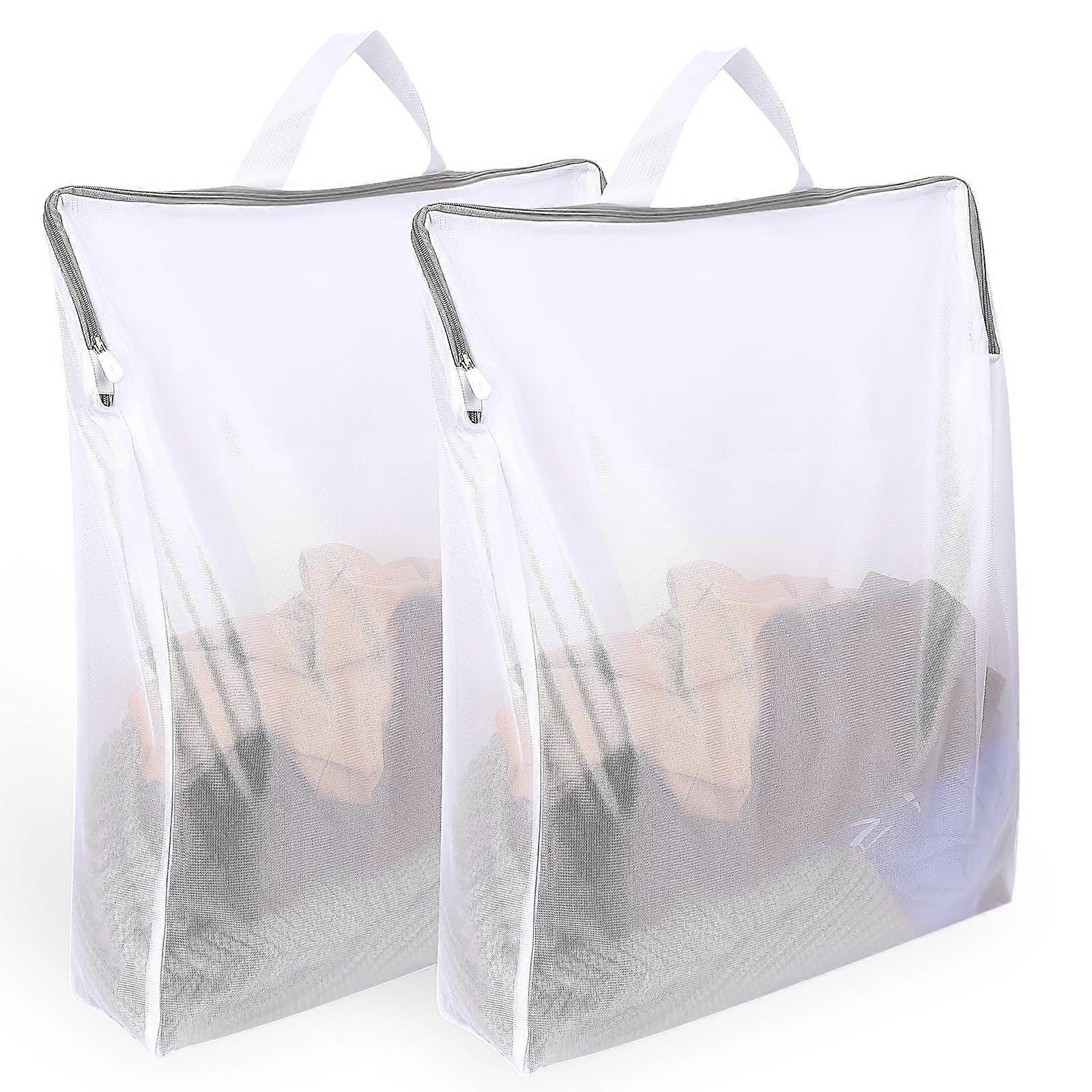 【Machine Wash Bags】Are you still worried about clothes getting tangled when machine washing? The machine wash laundry bags can protect clothes from tangling, snagging, tearing, or deforming during washing, and extend the life of coats, sweaters, underwear, socks, T-shirts and other clothes. 【Large Capacity】2 Pieces 40 x 50 cm mesh laundry bags, widened design at the bottom and sides to hold more clothes. The large opening is more convenient for storing or taking out clothes. 【Laundry Bag with Handle】The laundry bag with handle is easy to carry and perfect for transporting clothes to the laundromat or laundry room. You can hang the laundry bag on the hamper or on the door as you like. 【Dense Mesh Design】Reusable and breathable laundry bag, dense mesh design, fine workmanship, durable. The polyester material is durable enough for long time use. The mesh is very dense and fine, with small holes, it is easy to filter dust and dirt, so that the detergent and water flow easily for cleaning. 【Ideal Choice】The laundry bag is ideal for protecting delicate clothes, suitable for shirts, socks, bras, underwear, baby clothes, coats, jackets, jeans and shoes.